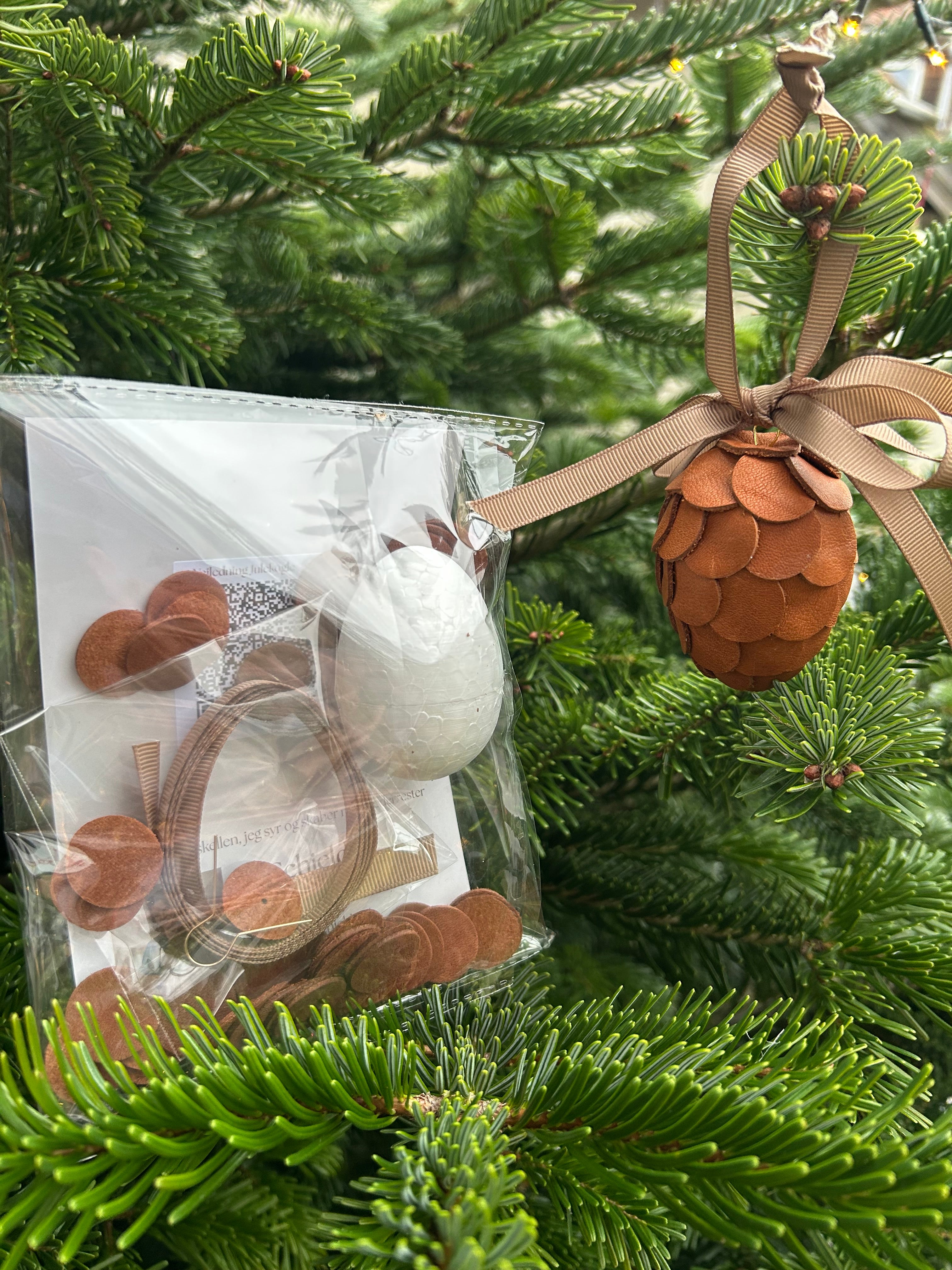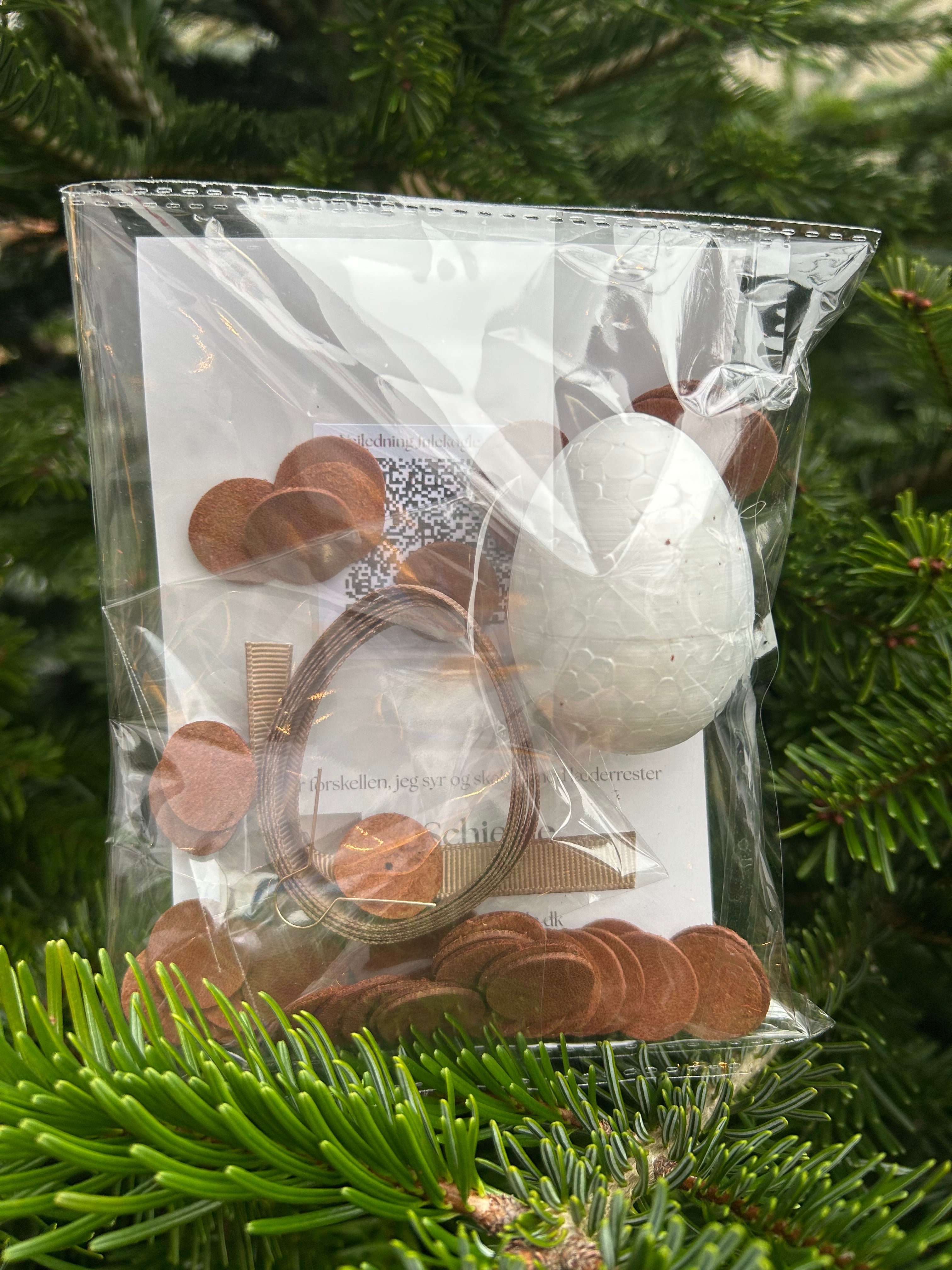 Kittet indeholder styroporæg, lædercirkler, bånd til ophæng og QR-kode til instruktionsvideo til koglen.