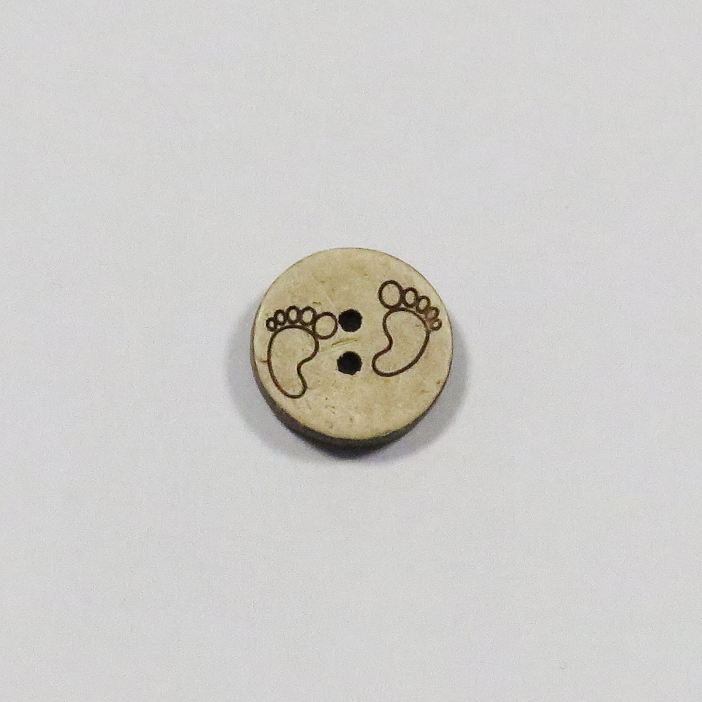 Denne søde kokosknap måler 15 mm og har et fint print af små fødder på forsiden. Den naturlige kokosoverflade giver et varmt og rustikt udtryk, mens fodsporene tilføjer et nuttet og personligt præg.