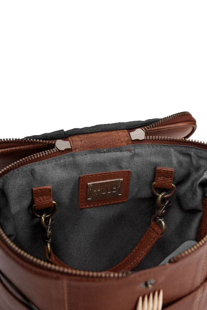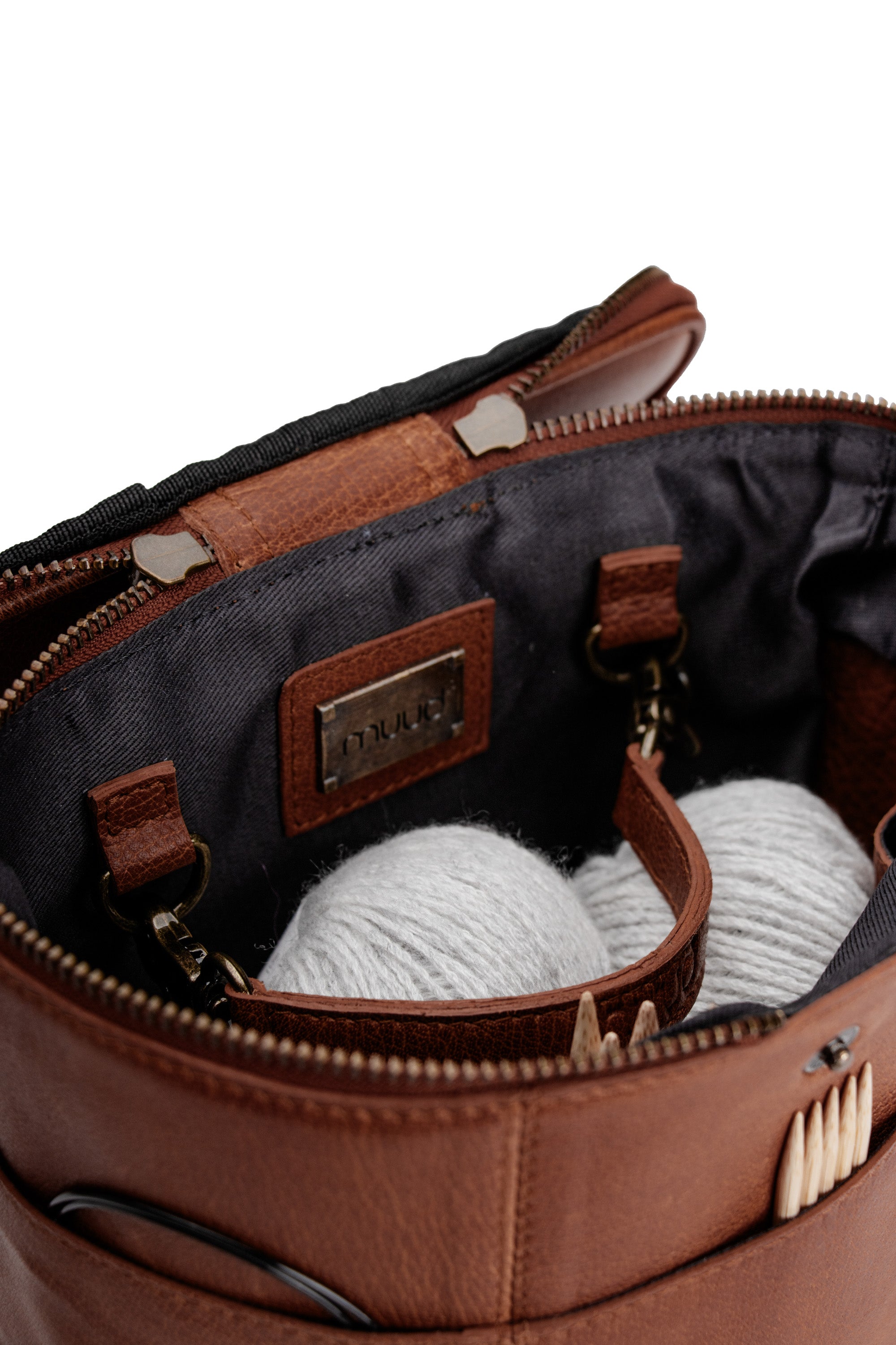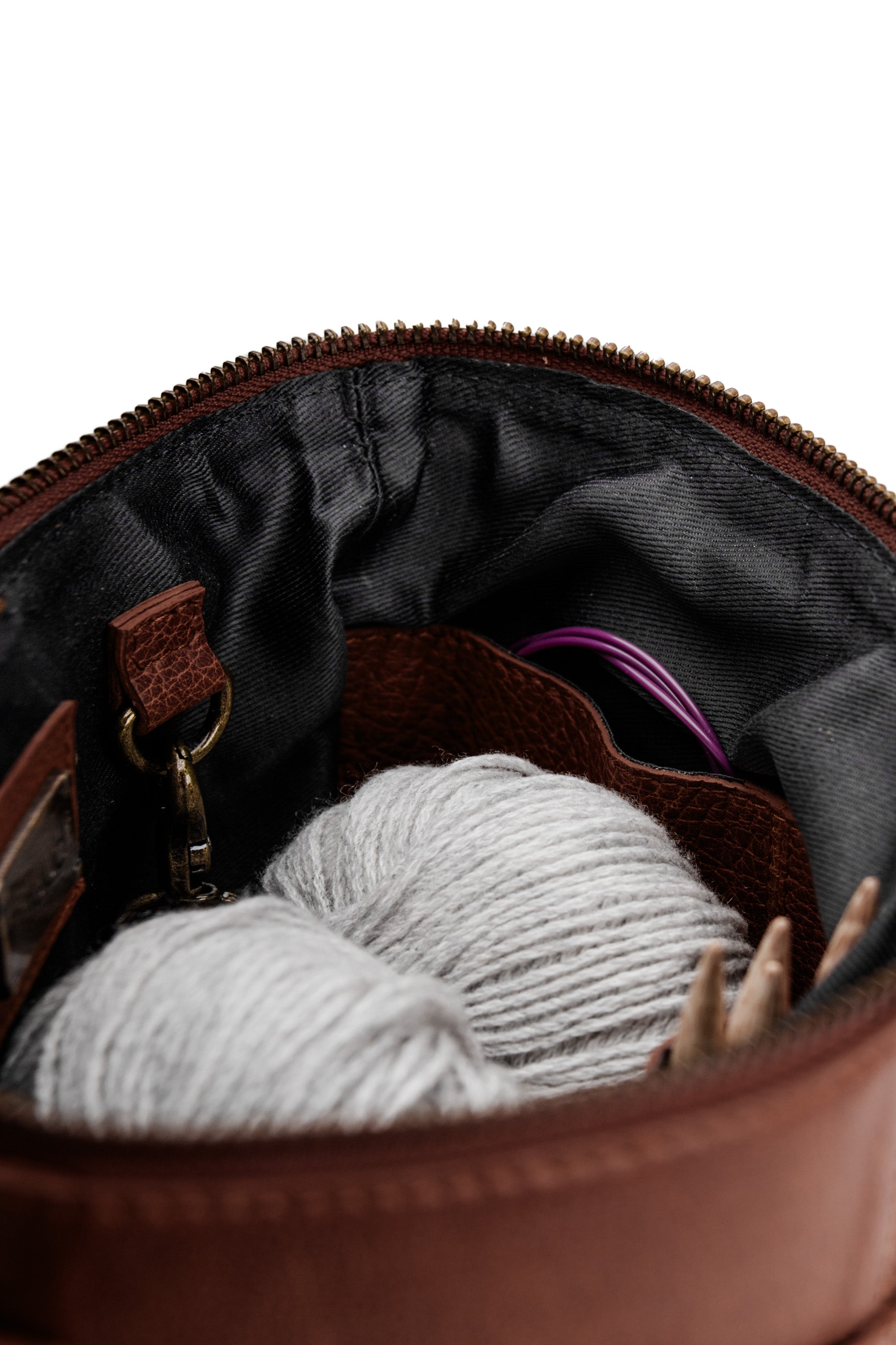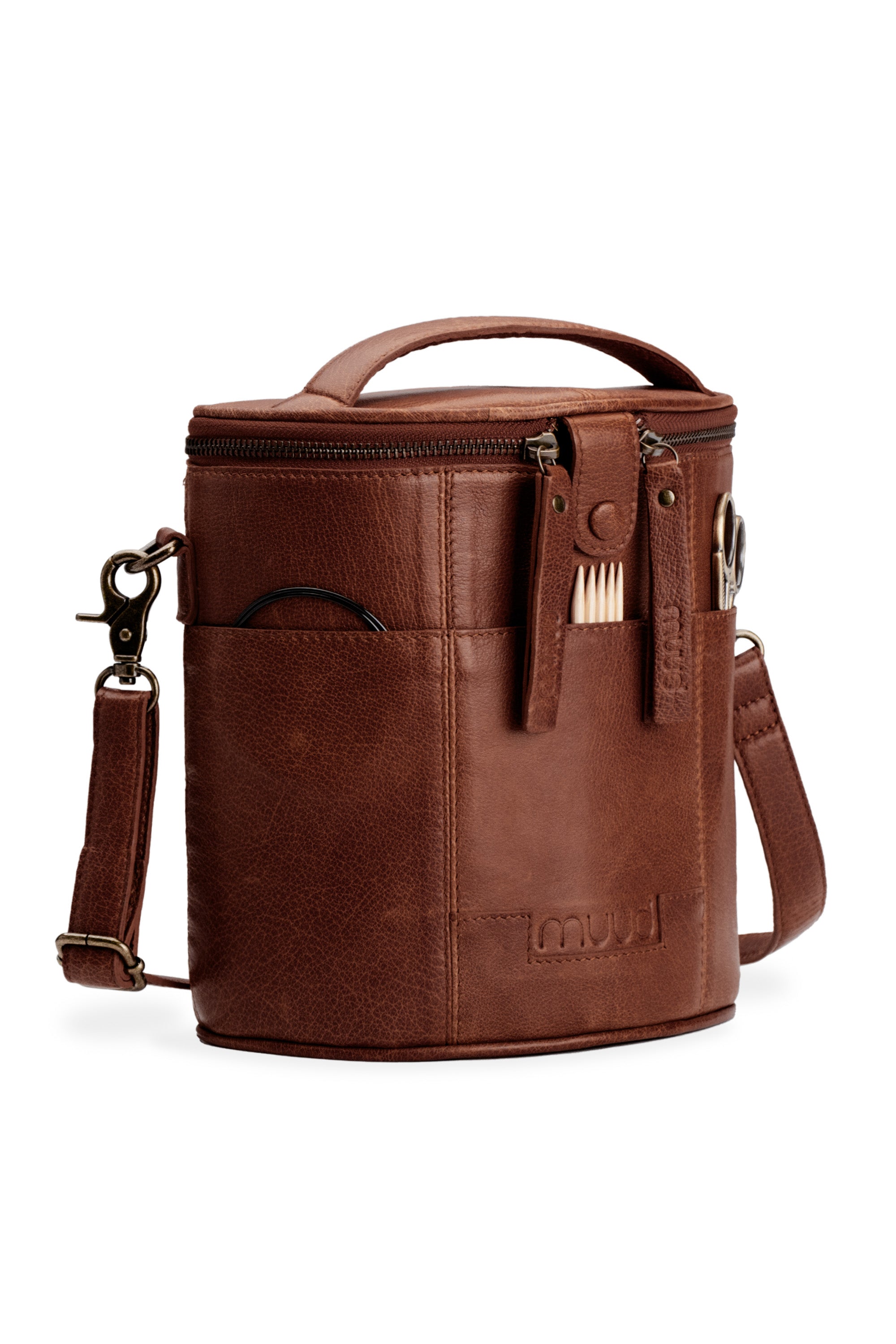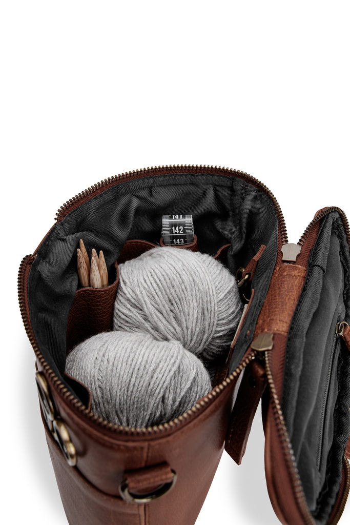 Grace fra Muud er en elegant og funktionel halvmåneormet læderprojekttaske. Tasken er perfekt til opbevaring og transport af dine strikke- og hækleprojekter og kombinerer praktiske detaljer med et stilfuldt udtryk. Den justerbare skulderrem giver fleksibilitet, så du nemt kan bære tasken på den måde, der passer dig bedst.