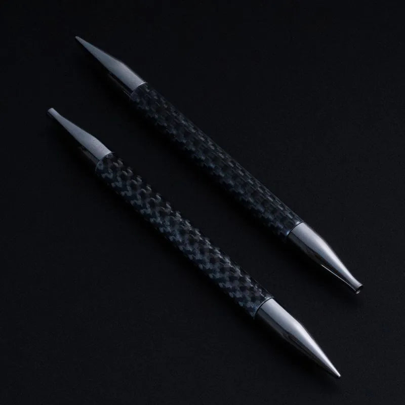 Karbonz Élan fra Knit Pro er et nyt eksklusivt strikkepindesæt i karbon. Pindene er glatte, lette og stærke, og de er præget med et smukt mønster, som kun kan ses, men ikke mærkes på pindene.