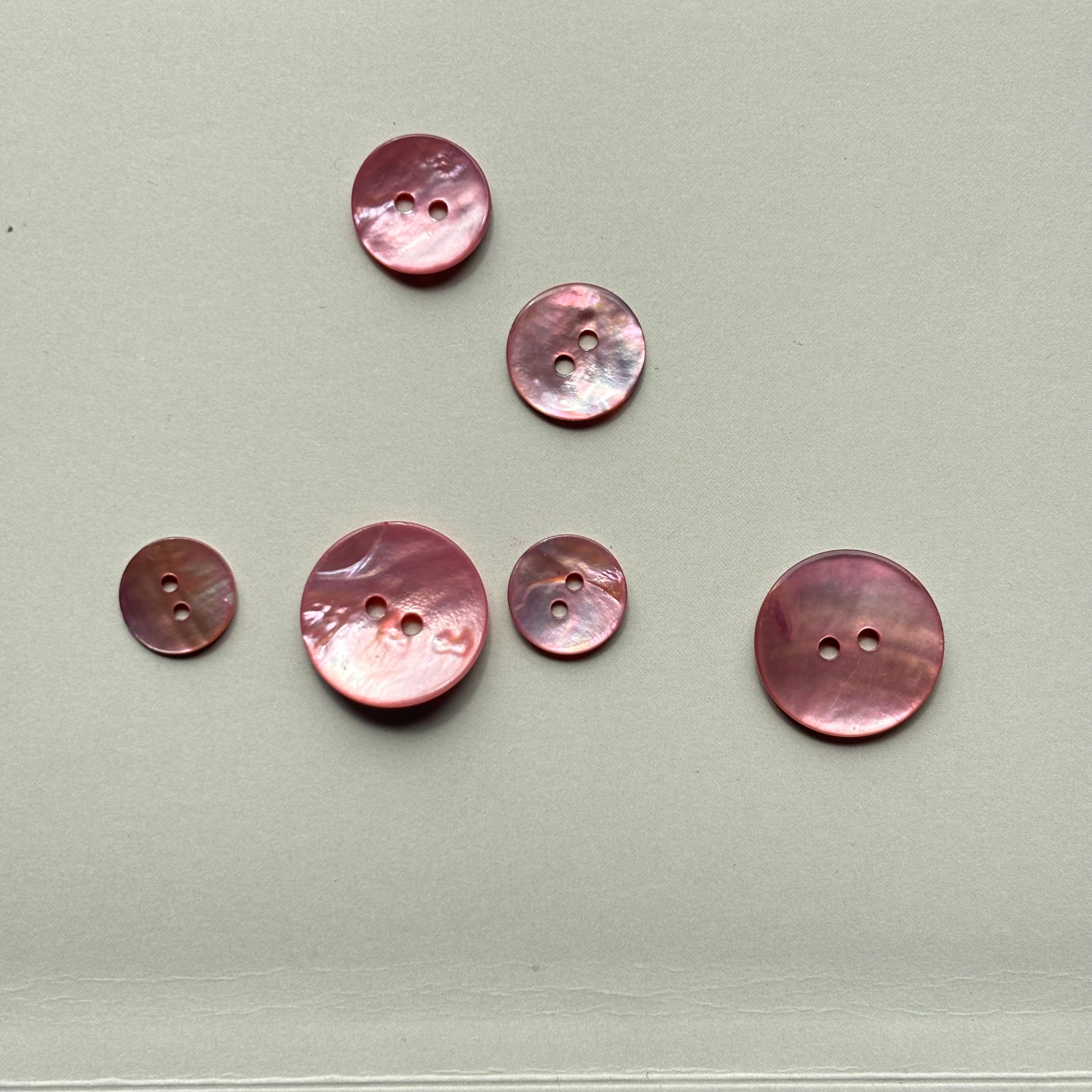 Elegant perlemorsknap i en smuk lyserød nuance med diskret glans og klassisk rund form. Knappen fås i tre størrelser: 13 mm, 15 mm og 20 mm – alle med 2 huller til nem montering.