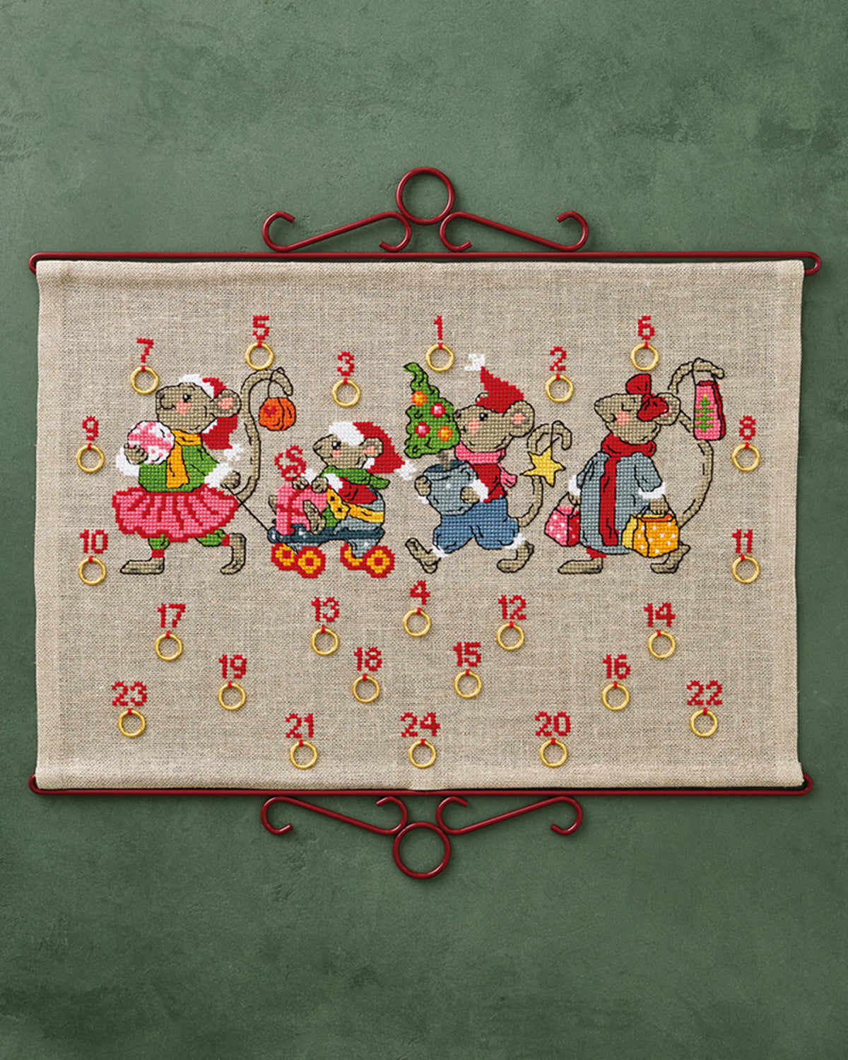 Kom i julestemning med denne smukt broderede julekalender fra Permin – “Musestribe”. Broderiet er udført i klassiske korssting med helt garn og fine stikkesting med delt garn (3/6 tråd) på naturfarvet hørlærred.