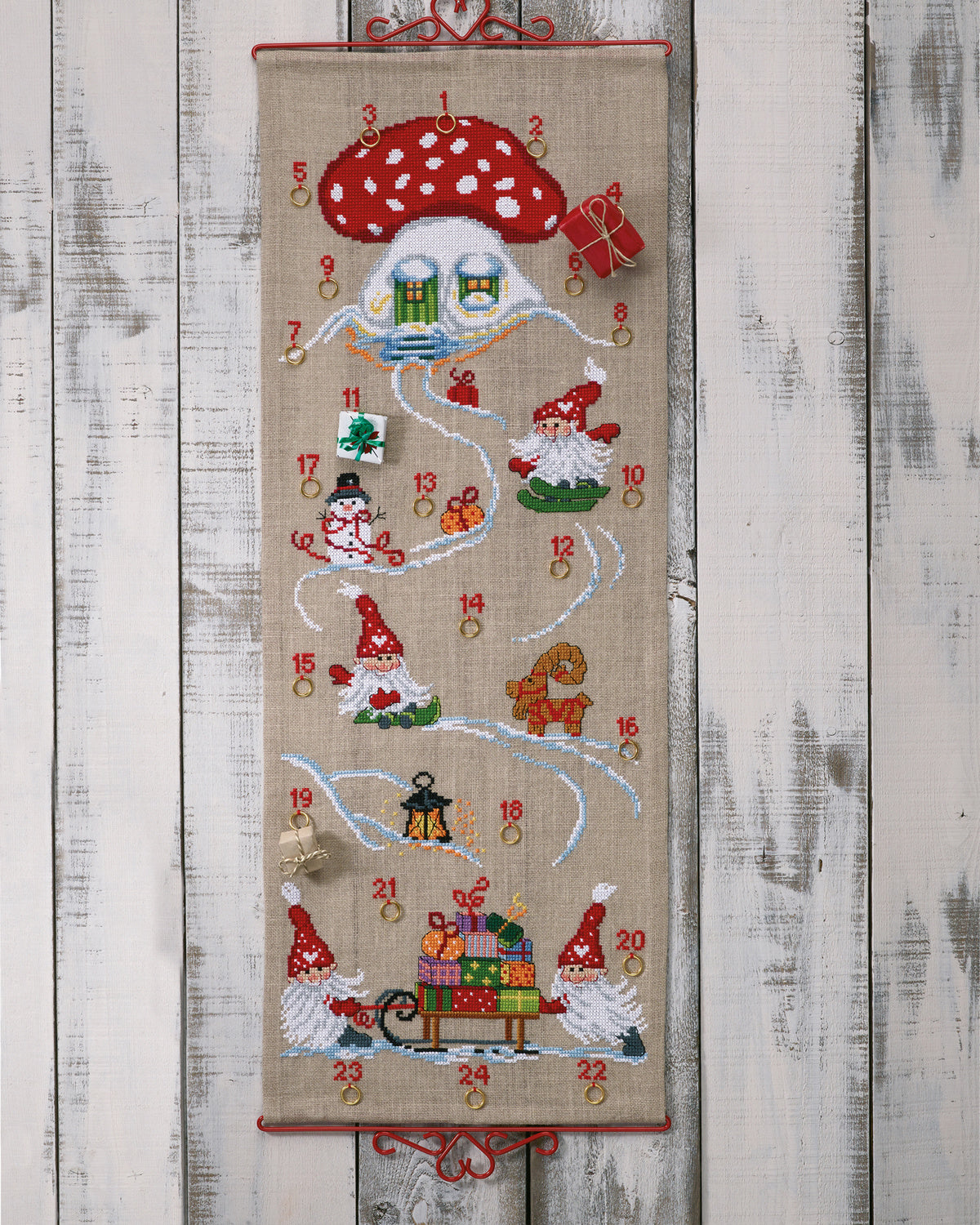 Kom i julestemning med denne fine broderede julekalender fra Permin – “Nisser og gaver”. Broderiet er udført i klassiske korssting med helt garn og fine stikkesting med delt garn (2/6 tråd) på naturfarvet hørlærred.
