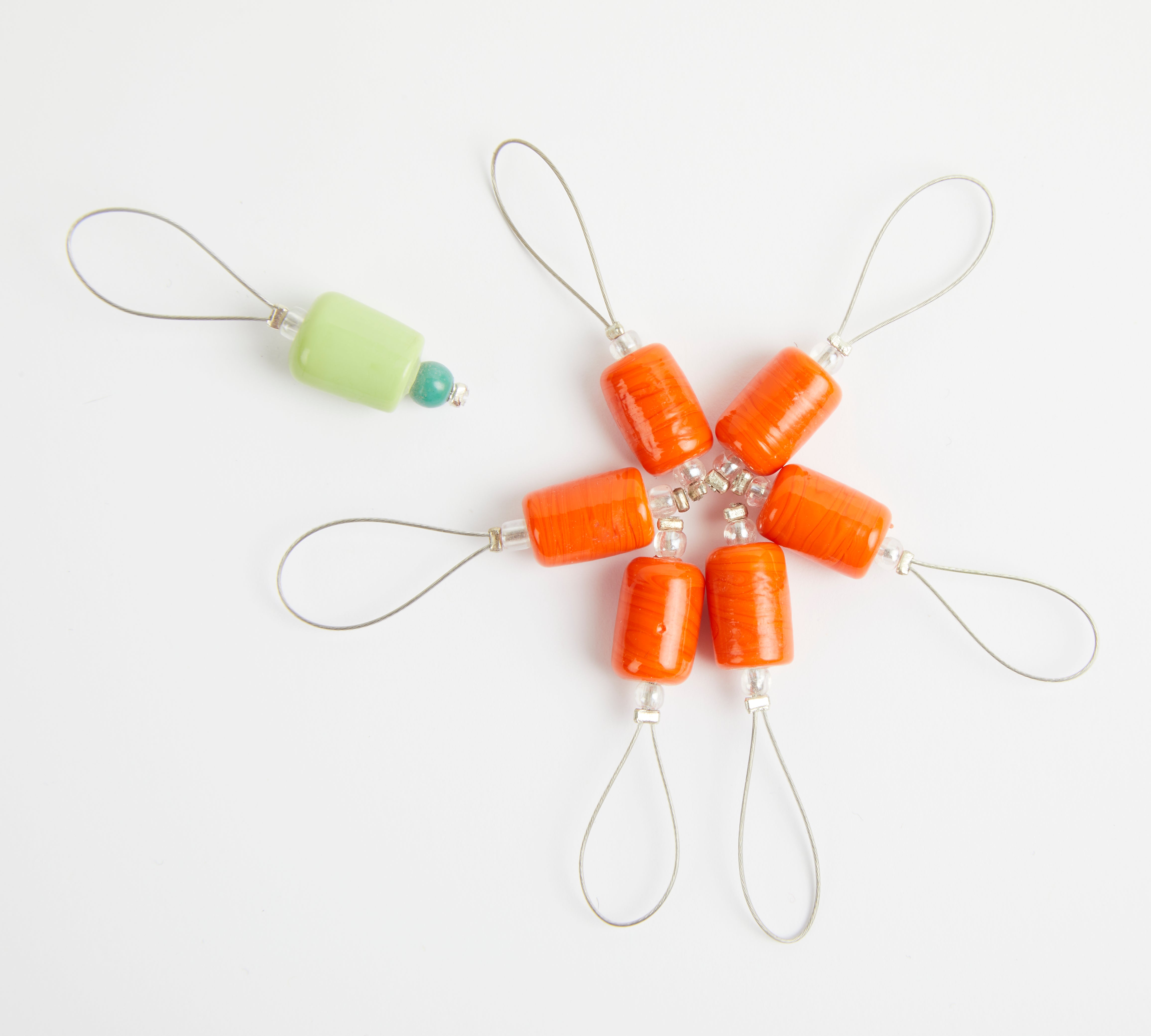 Tilføj lidt glimt til strikketøjet med disse fine maskemarkører fra KnitPro. Pakken indeholder 7 markører – 6 orange og 1 større grøn, perfekt som omgangsmarkør. De er lavet af glas og hænger på en tynd, fleksibel stålwire, der glider nemt med rundt på pinden. Smukke og praktiske i ét!