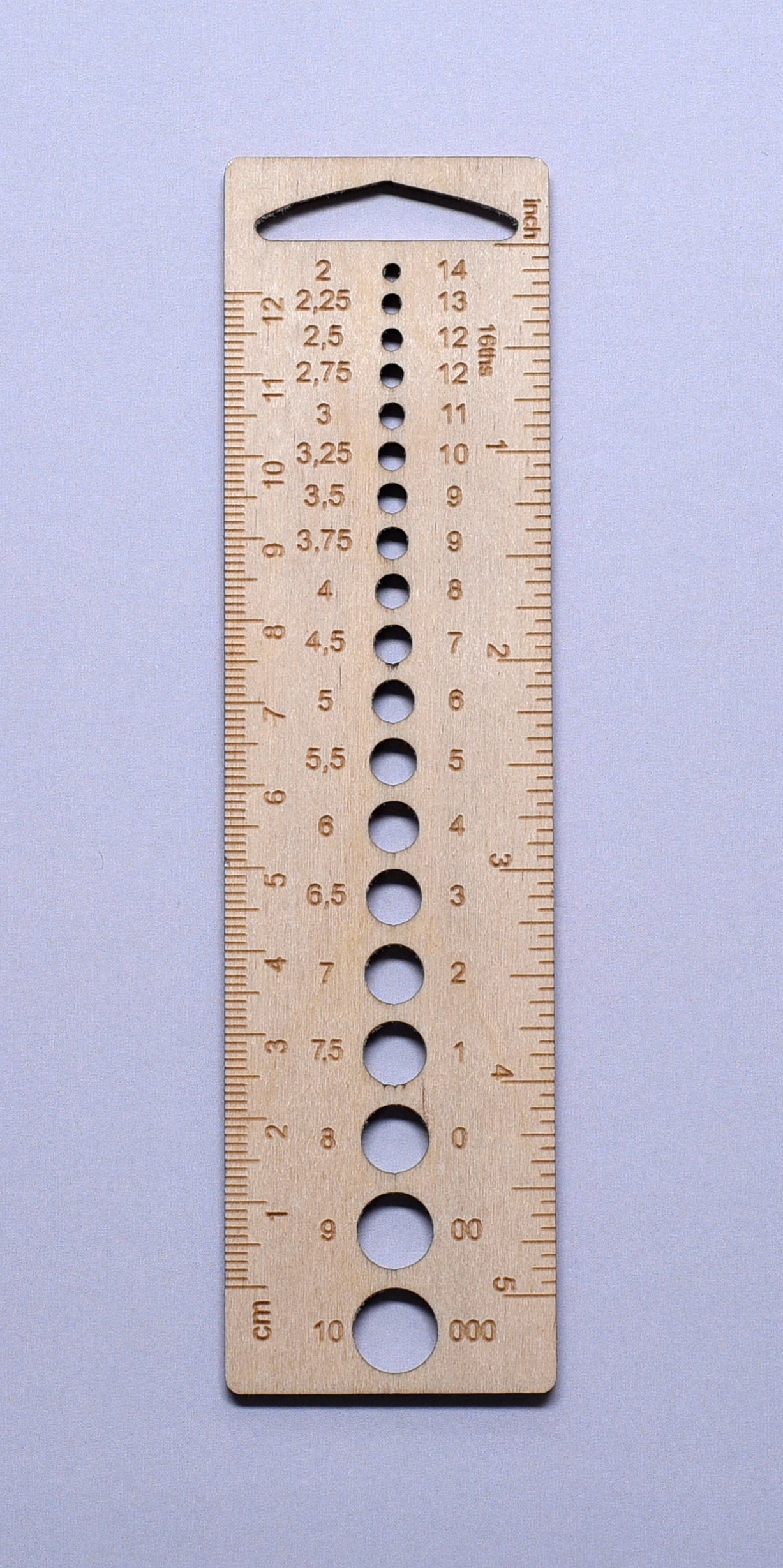Lineal med pindemål i træ, som både måler i cm og inch - smart til de amerikanske strikkeopskrifter.