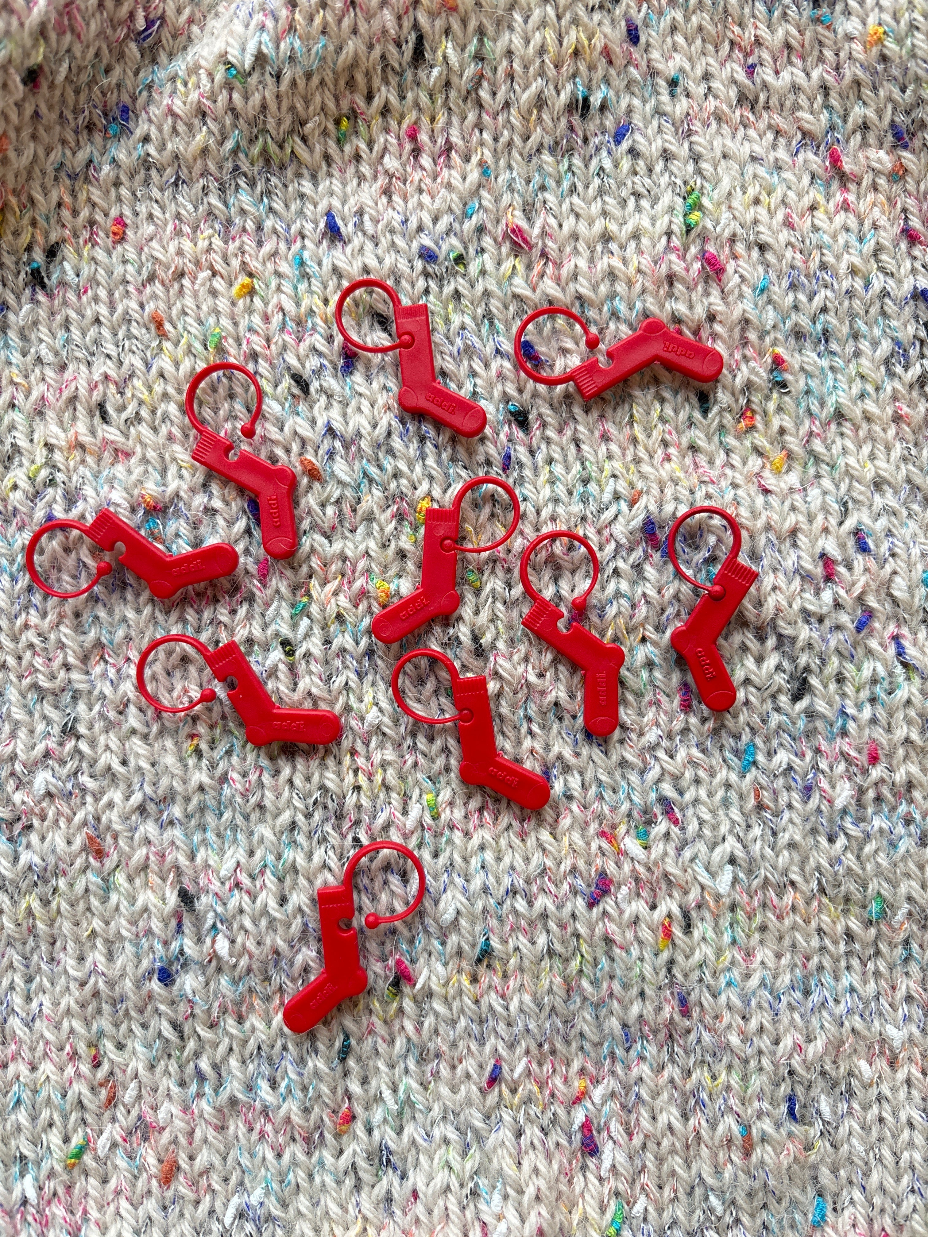 Hav den fine lille røde sok hængende i dit strikketøj til at markere omgangsstart eller andet vigtigt.