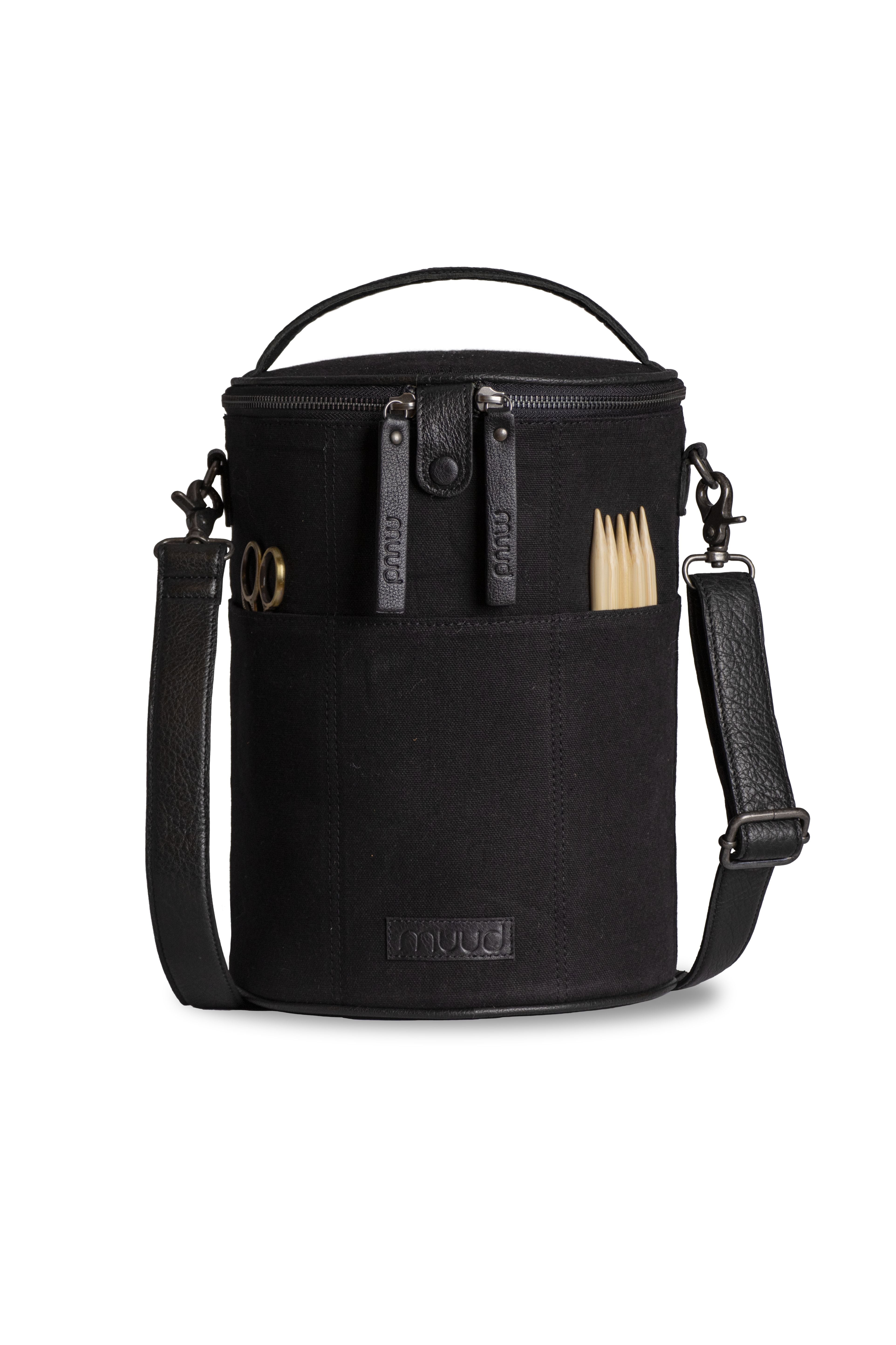 Den rummelige taske er udstyret med praktiske lommer på både indersiden og ydersiden, hvilket giver dig mulighed for at organisere dit udstyr. Med en højde på 28 cm og en diameter på 21 cm er der plads til alt fra garnnøgler og strikkepinde til målebånd, sakse og andre nødvendige redskaber.