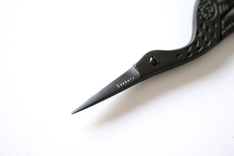Storkesaksen ligger behageligt i fingrene og er dejlig skarp. Det måler ca 9 cm i længden.