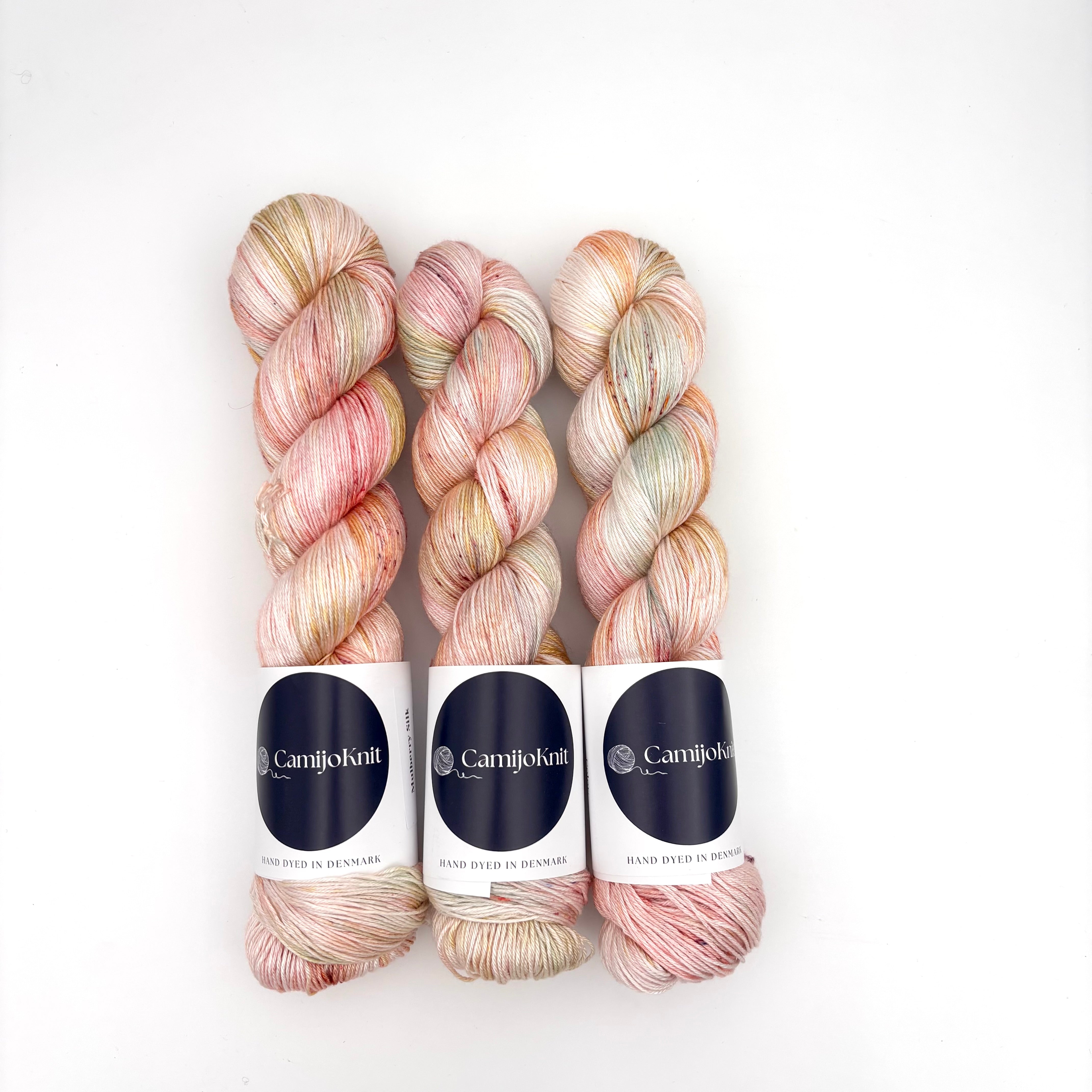 Camijo Silke fra CamijoKnit er indbegrebet af eksklusivitet og luksus. Dette pure silk garn er nemlig spundet af fire tråde 100% Mulberry silke, og så er det håndfarvet!