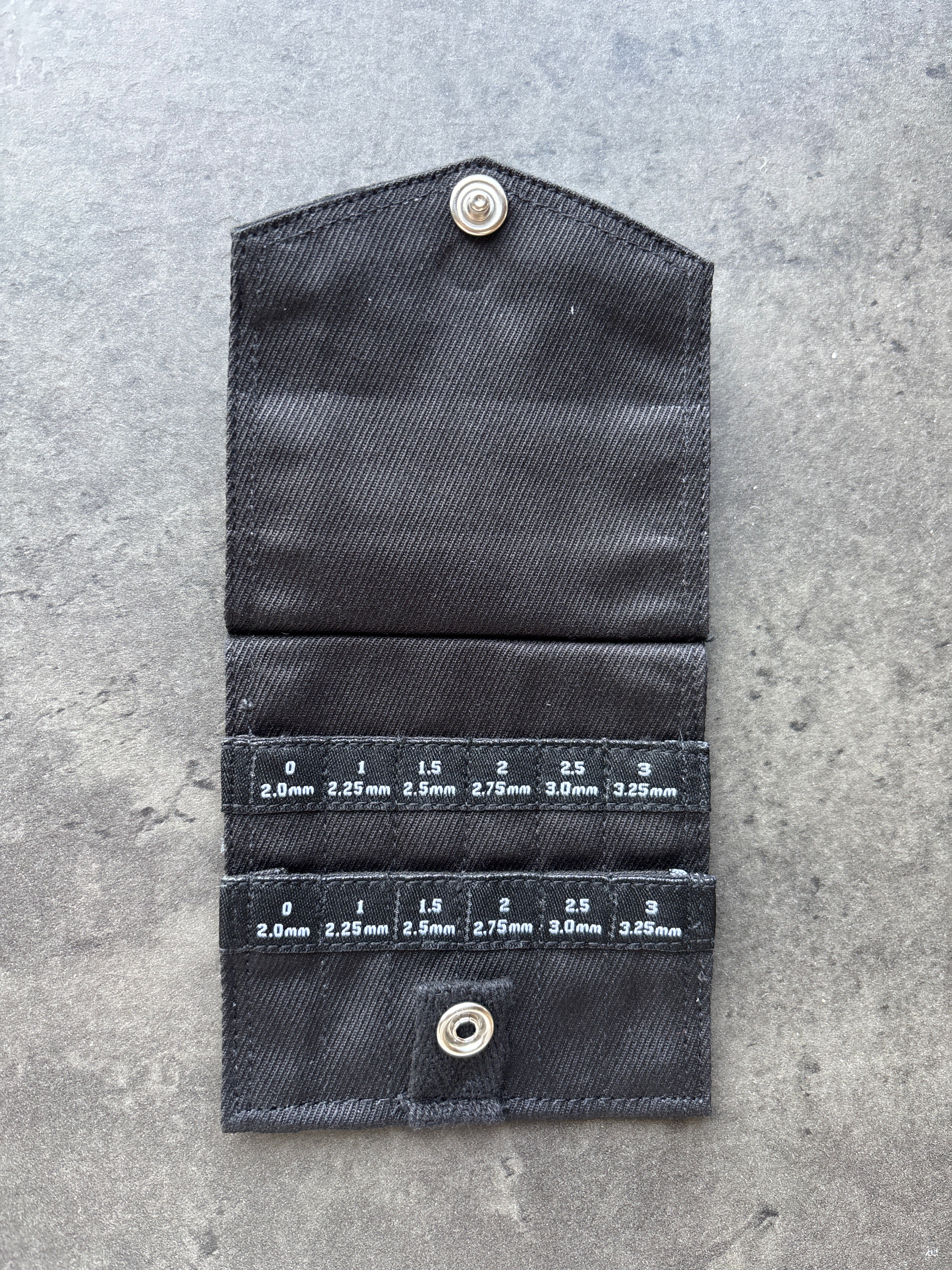 Denne lille pindeholder kan indeholde 12 sæt Shorties™ (5 & 8 cm) udskiftelige pinde i størrelserne 2 – 3,25 mm. Hver lomme er mærket, og trykknaplukningen holder pindene sikkert på plads.
